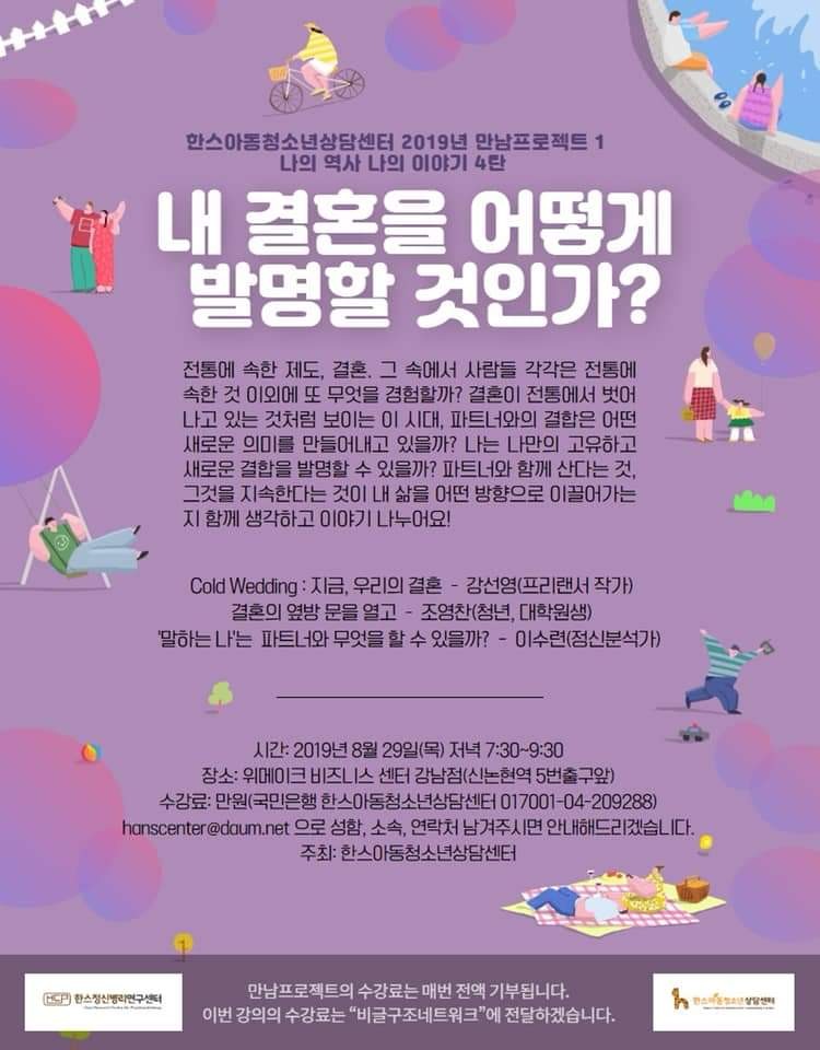 ![]() 안녕하세요, 위메이크비즈니스센터 소호지기입니다. 다음주 목요일 위메이크 강남점 비즈라운지에서 한스아동청소년상담센터에서 주관하는 2019년 만남프로젝트1 나의 역사 나의 이야기 4탄 '내 결혼을 어떻게 발명할 것인가?' 강의가 열립니다. 관심있으신 분들의 많은 참여 부탁드립니다. ![]() 시간 : 2019년 8월 29일(목) 저녁 7:30~9:30 장소 : 위메이크비즈니스센터 강남점(신논현역 5번출구 앞) 수강료 : 만원(국민은행 한스아동청소년상담센터 017001-04-209288) * 만남프로젝트의 수강료는 매번 전액 기부됩니다. 이번 강의의 수강료는 "비글구조네트워크"에 전달하겠습니다. |